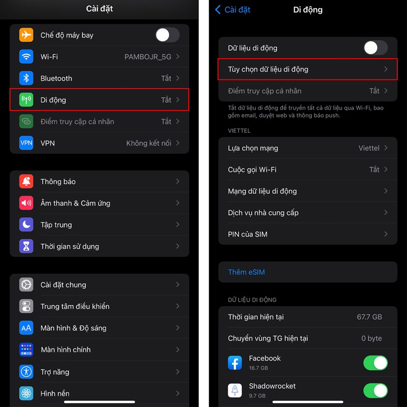 Bước 1: Truy cập vào Cài đặt của iPhone > Chọn tiếp vào phần Di động > Nhấn vào Tùy chọn dữ liệu di động.