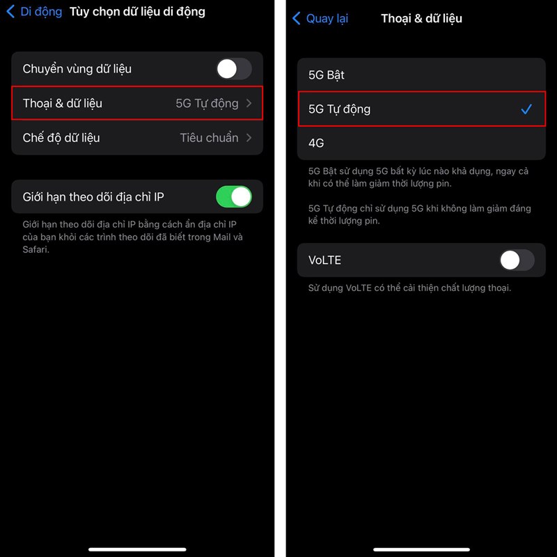 Bước 2: Tiếp theo kích chọn vào Thoại & dữ liệu > Cuối cùng là bạn hãy nhấn tích chọn vào mục 5G Tự động để khi mở dữ liệu thì 5G sẽ được chọn sử dụng nha.