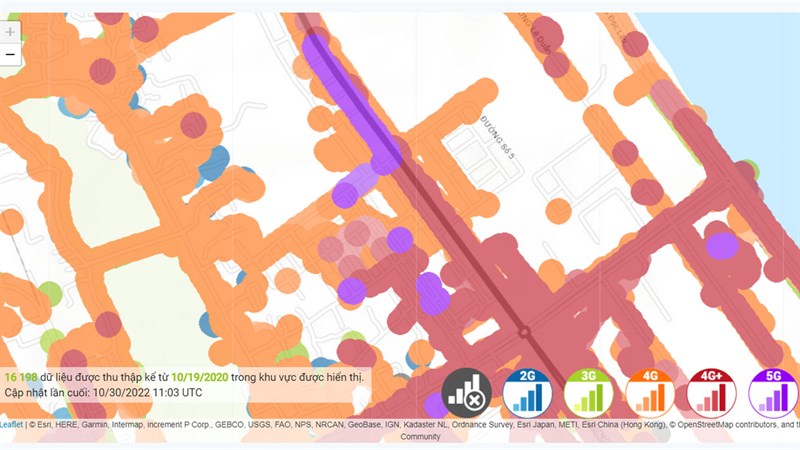 Bước 2: Tại đây hãy dùng con lăn chuột để phóng to bản đồ và chú ý vòng tròn màu sắc để nhận diện nha, màu tím là nơi phủ sóng 5G đó.